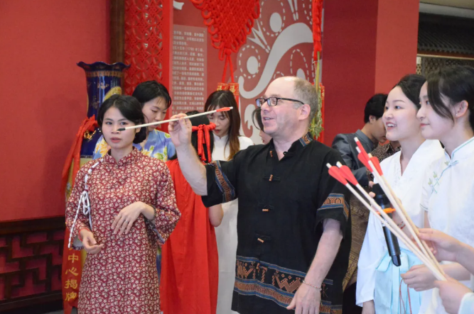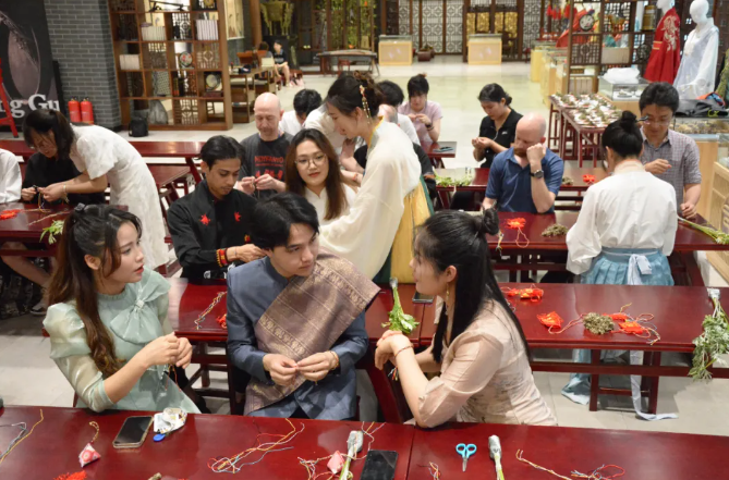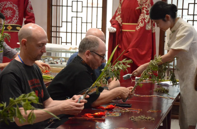在讲解团队的介绍下,外籍师生们学习编五彩绳,制作香囊,亲手扎艾叶香蒲,了解悬挂方法,还体验了端午小游戏——射五毒,品尝了美味的粽子。
