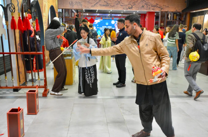 外籍师生们还体验了投壶、海底捞月、欢乐套圈等小游戏,品尝了美味的月饼。